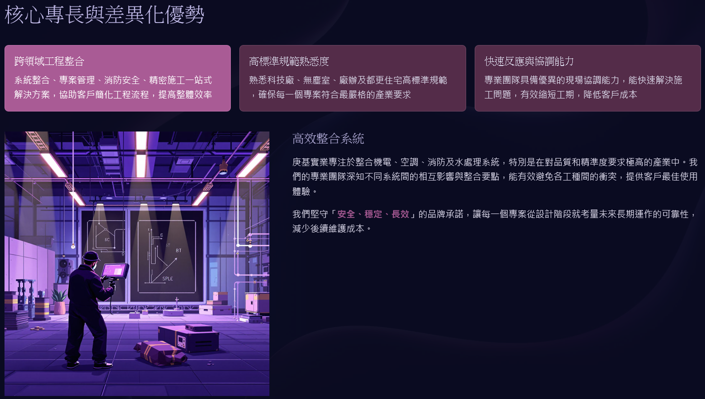 如果您正在尋找值得信賴的機電工程整合夥伴,庚基實業將以專業實力與十餘年經驗,協助您打造安全舒適、符合永續需求的空間環境。